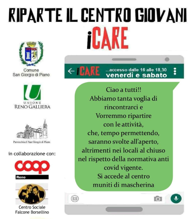 Il progetto iCARE nasce dalla collaborazione tra il Comune e la Parrocchia di San Giorgio di Piano, per offrire ai ragazzi e alle ragazze dagli 11 ai 16 anni un luogo di aggregazione dove incontrarsi e dedicarsi al “prendersi cura” di sé e degli atri.